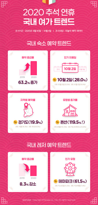 7일 여가 플랫폼 기업 야놀자가 올해 추석 연휴(9월30일~10월4일) 동안 국내 여가 데이터를 분석한 결과에 따르면 국내 숙소 이용 건수는 지난해 추석 연휴(19년 9월12일~15일) 대비 63.2% 증가했다.